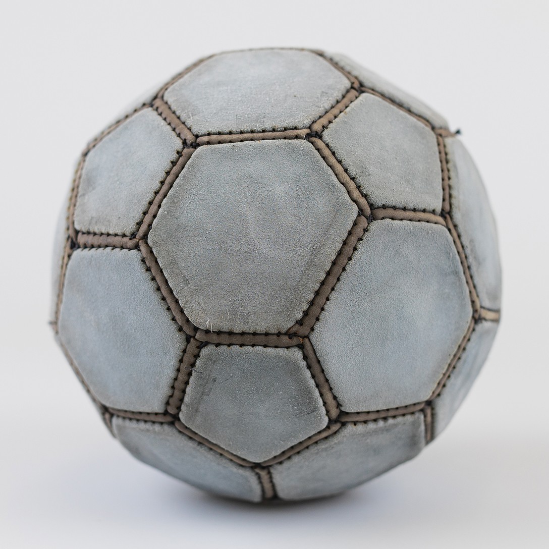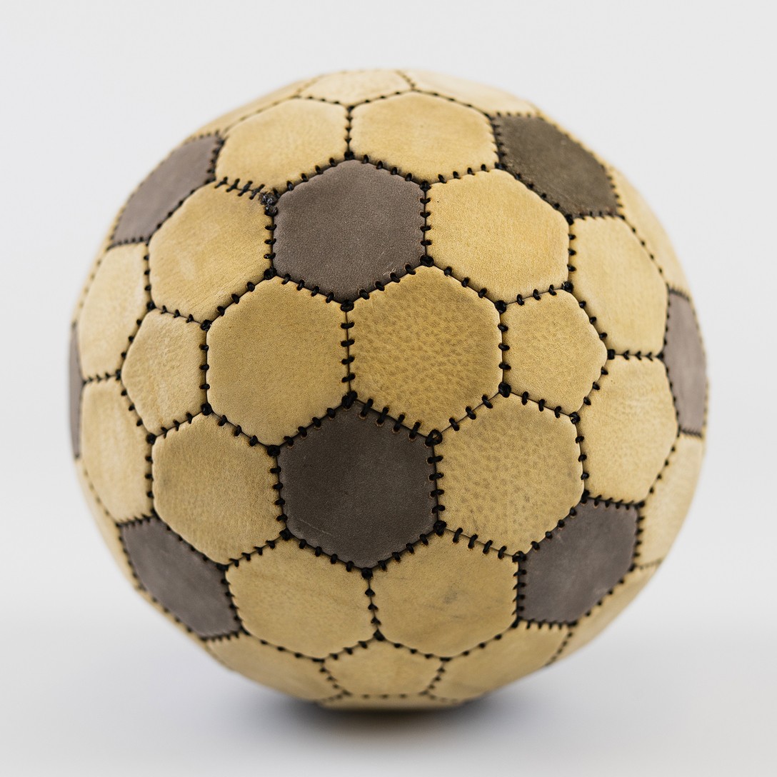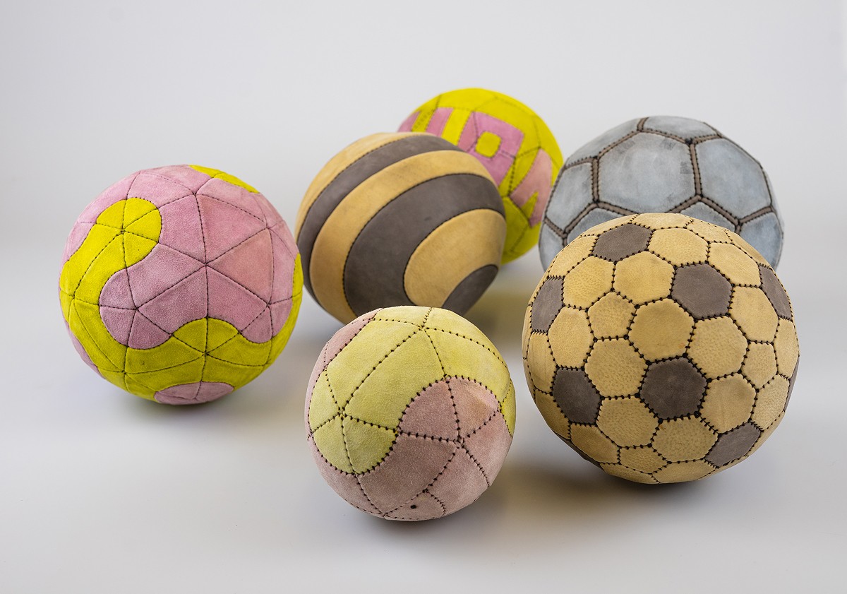 Each design starts with sketches and a 3D model in Blender to define the geometry. The faces are flattened, exported, and prepared in Illustrator for laser cutting. The leather panels are then sewed together by hand until the ball takes shape.