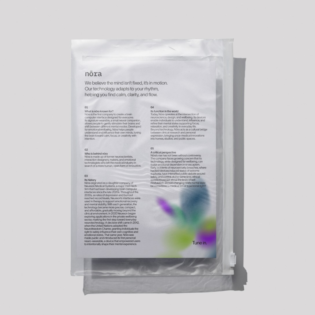 Nora is a design fiction project set in 2050, imagining a future where non invasive brain–computer interfaces are part of everyday life. The concept explores a lifestyle device that allows users to subtly tune their cognitive state through gentle electromagnetic stimulation.