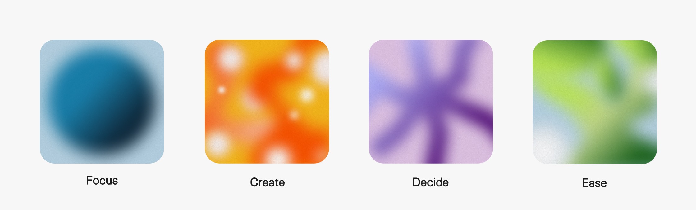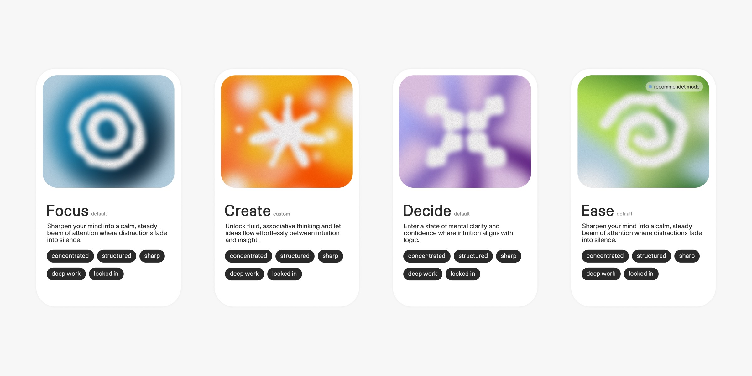 Particular attention was given to the gradients representing the four example modes Focus, Create, Decide, and Ease. Each gradient translates a cognitive atmosphere into distinct visuals that define the design language across the interface.